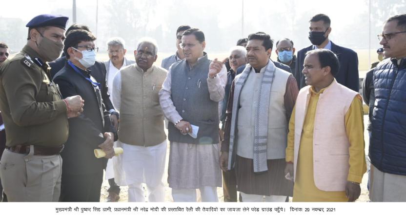 मुख्यमंत्री पुष्कर सिंह धामी, प्रधानमंत्री नरेंद्र मोदी की प्रस्तावित रैली की तैयारियों का जायजा लेने परेड ग्राउंड पहुँचे। मुख्यमंत्री ने जिला प्रशासन को समय से सभी व्यवस्थाओं को पूरा करने के निर्देश दिए। मुख्यमंत्री ने कहा कि प्रधानमंत्री जी द्वारा 30 हज़ार करोड़ रूपए की योजनाओं का लोकार्पण एवं शिलान्यास किया जाएगा।