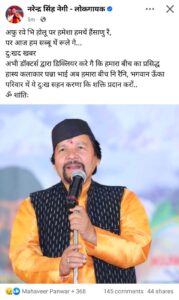 देहरादून। सबको हंसाने वाले घनानंद घन्ना भाई आज सबको रुलाकर चले गए। लंबी बीमारी के बाद देहरादून के एक निजी अस्पताल में उन्होंने अंतिम सांस ली। मुख्यमंत्री, गढ़ रत्न नरेंद्र सिंह नेगी, जागर सम्राट पद्मश्री प्रीतम भरतवाण समेत अभिनेता बलदेव राणा, किशना बगोट समेत कलाकारों ने उनके निधन पर शोक जताया है।